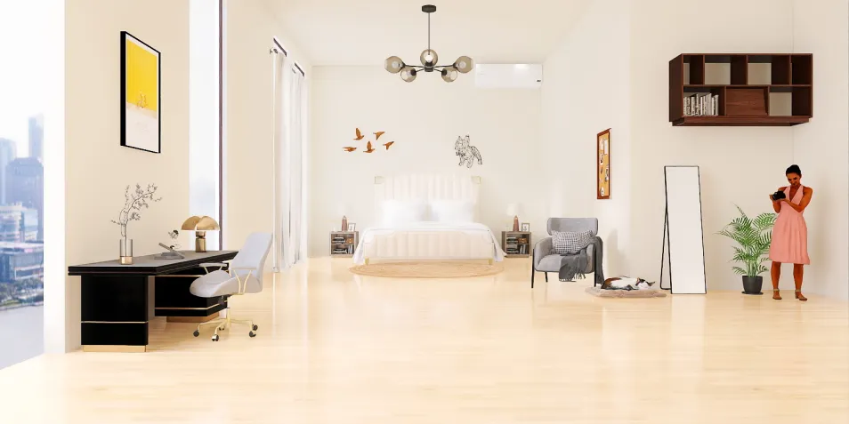White themed, has an office space and also a place to relax, good lighting and nice room