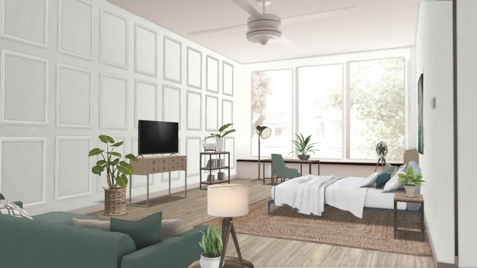 The basket holding the tree was the inspiration for this room. From that bohemian looking style, I added some soft teals, and of course a bunch of plants to make the apartment more homie. :)