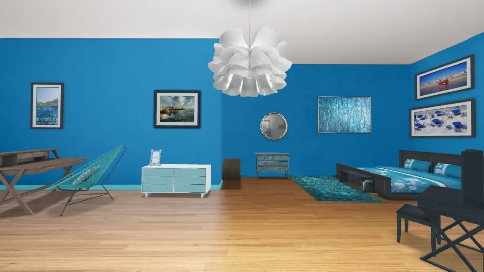 Bright bold blues make this room pop. This is a modern bedroom with lots of light.