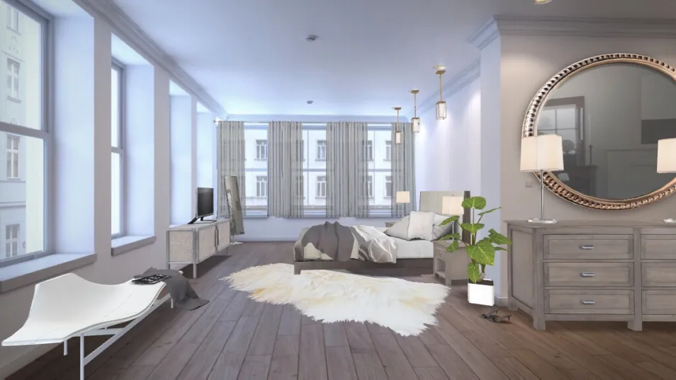 Bedroom with lots of grey tones.