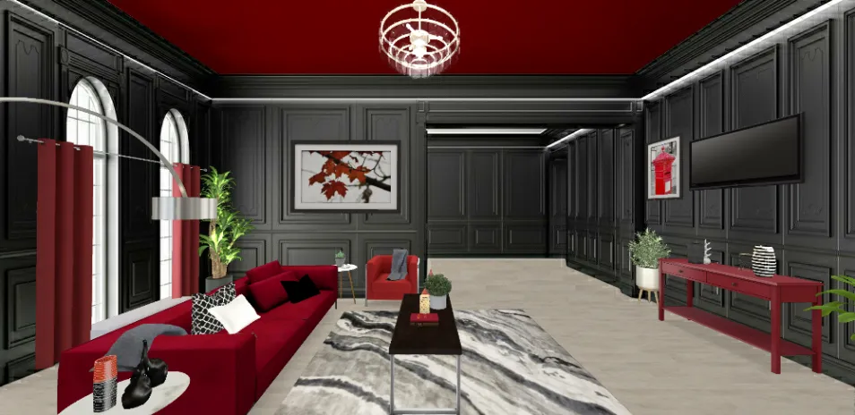 This is a beautiful dark themed living room with prominent pops of red. Red is a strong and striking color that is also sophisticated and alluring. Minor pops of silvers and greys draw help draw attention to the rich reds and blacks. Instead of an accent wall a brightly colored eye-catching ceiling is the accent on top. Plants bring a fresh feel into any room and they are placed in different areas to spruce up the space.