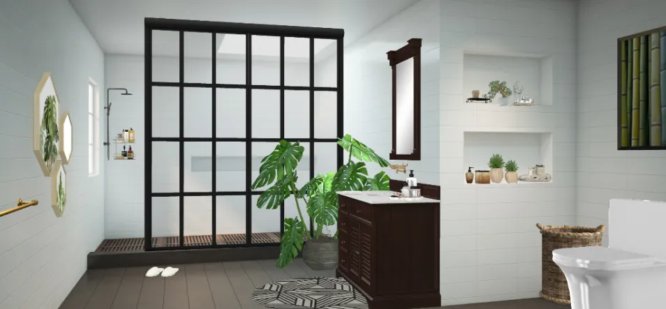 black and white bathroom with greenery and gold and wicker accessories