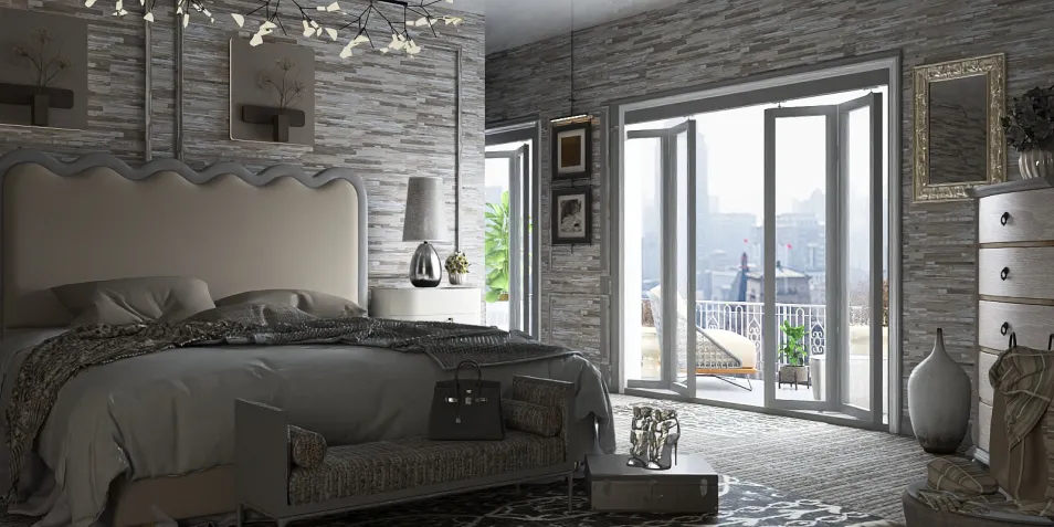 Step into **Celeste Haven**, where contemporary elegance meets timeless comfort. The centerpiece of the room, a stunning wavy headboard, adds a graceful flow to the space, complemented by plush pillows and a chic throw. The open double doors beckon you to a private balcony, revealing a mesmerizing cityscape that amplifies the feeling of effortless tranquility. Textured wallpaper, framed artwork, and a striking chandelier set the tone for refined ambiance, while thoughtfully placed accents—a metallic lamp, lush greenery, and a sleek dresser—enhance the room’s understated charm. Whether lounging on the cozy bench or admiring the soft glow of sunset through the open doors, **Celeste Haven** invites you to unwind in a world where beauty and comfort coexist.
