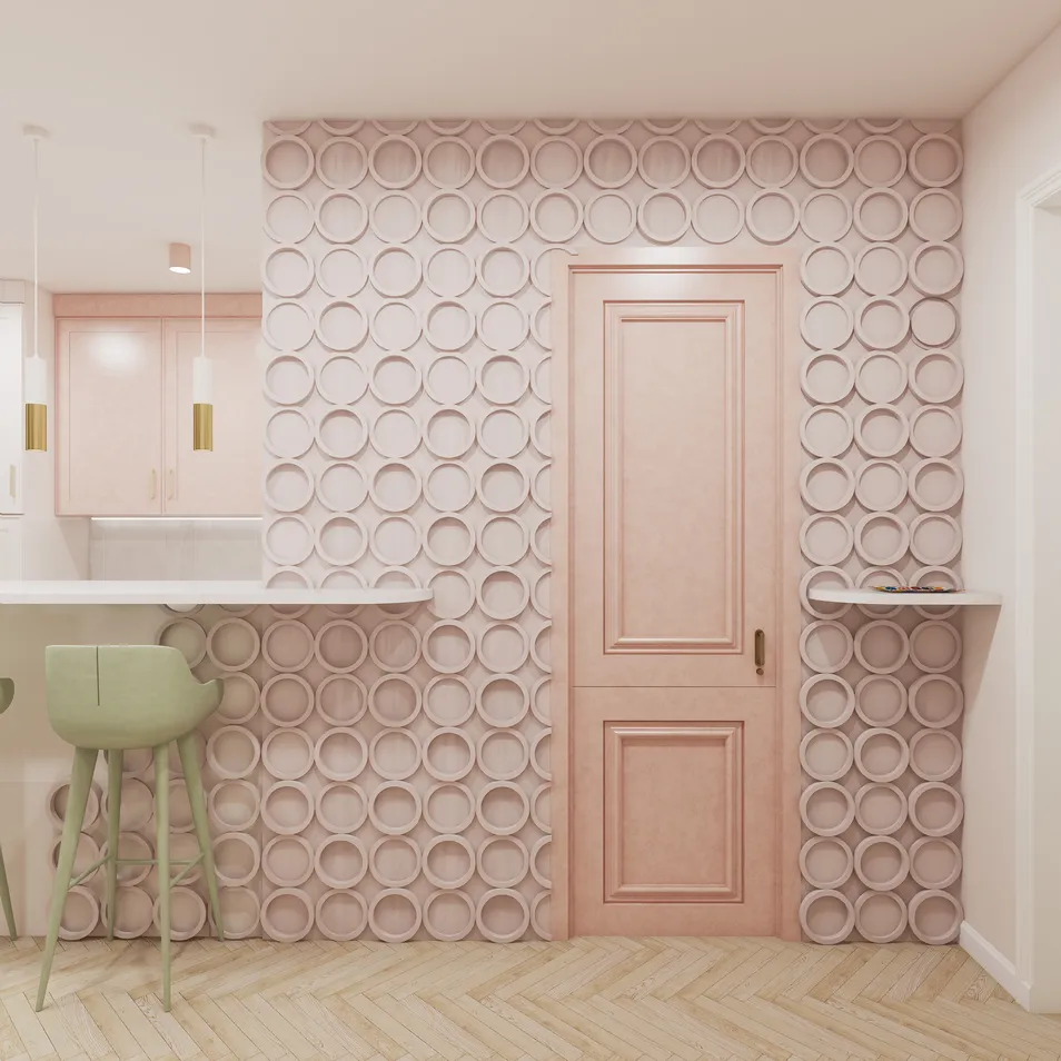 Bathed in soft light and shades of morandi rose, the studio radiates gentle elegance. Delicate contrasts of blush tones, sage, and apricot are accented with touches of gold and marble, adding a playful hint of luxury. The space feels light and feminine — graceful, vibrant, and full of charm, with every detail thoughtfully designed to enhance its inviting atmosphere.