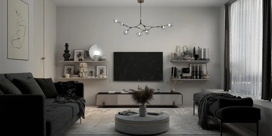 El espacio evoca una serenidad moderna, donde las líneas limpias y los tonos neutros se entrelazan con la luz suave. Un sofá gris oscuro se asienta en un suelo claro, mientras un arte minimalista adorna las paredes, creando un refugio de calma en la vorágine urbana.