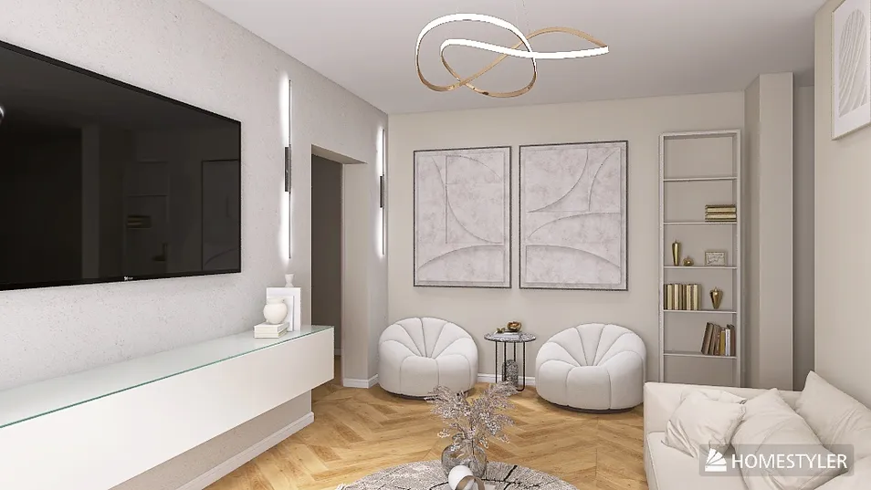 Un angolo di eleganza minimalista, dove le curve morbide delle poltrone bianche incontrano il rigore del parquet. La luce soffusa danza sulle pareti, creando un'atmosfera che invita alla contemplazione, mentre l'arte astratta si erge come un sussurro di creatività.