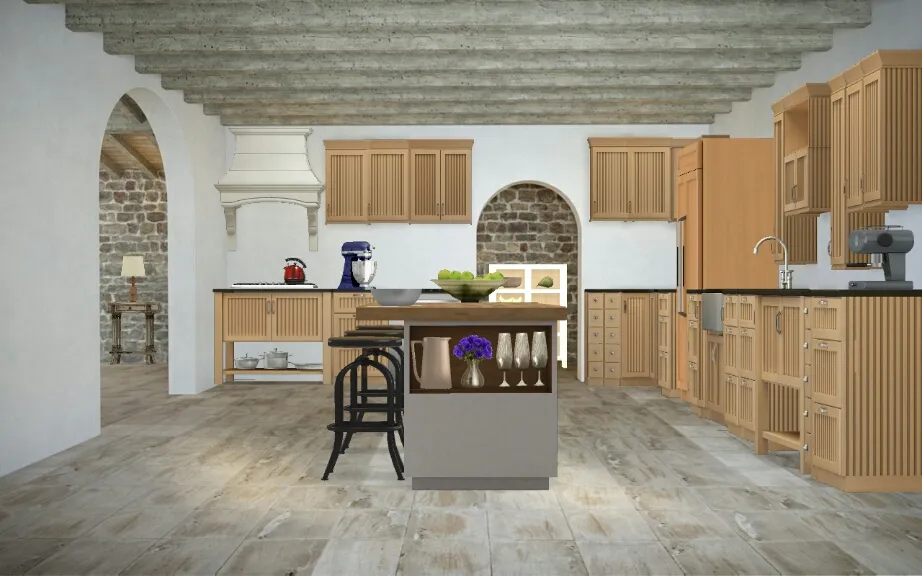 A European kitchen with a nice rock wall accent.