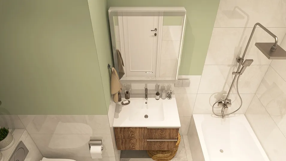 The bathroom is decorated in a light green shade with the addition of milky tiles. The bathroom has a washing machine and a toilet installation. A large illuminated mirror makes the bathroom visually larger and more comfortable.