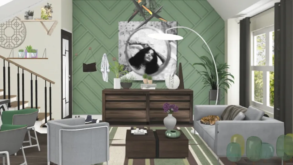 A small living room entryway for our chic green queen! 🍃🤍 (Artwork: While We Wait- Kehlani)