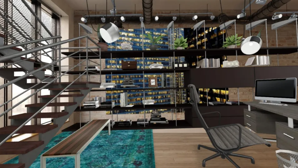 Duplex situado no centro da cidade, sendo o 1°piso espaço de escritório, ambiente composto por mobiliário de ferro e madeira. As paredes e conduites expostos, completam o estilo industrial.