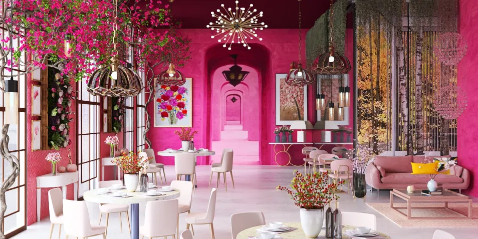 In the heart of this pink labyrinth, whispers of jazz float through the air, mingling with the scent of forgotten whiskey. A cat lounges on a velvet chair, while unfinished manuscripts lie scattered, capturing the essence of dreams half-formed, like shadows lost in the vibrant hue.