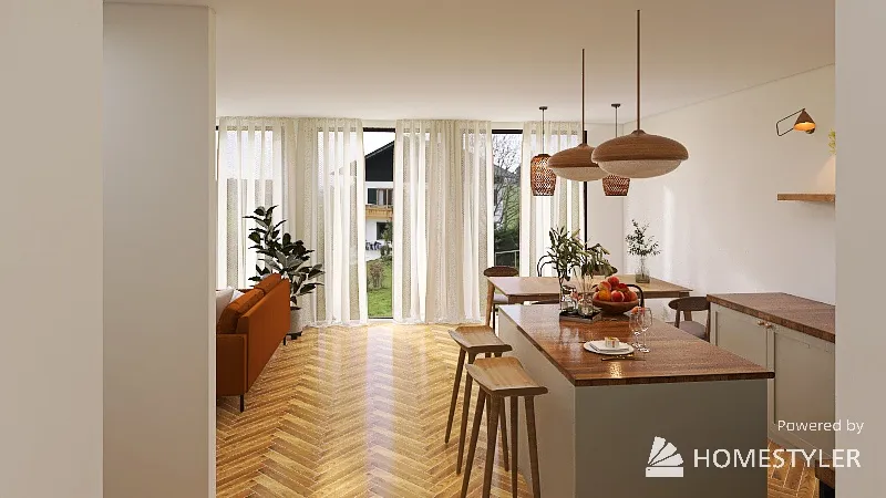 W świetle poranka, przestrzeń tętni życiem. Drewniane akcenty kontrastują z jasnym światłem, a eleganckie krzesła zapraszają do wspólnego biesiadowania. Zasłony, jak delikatne marzenia, tańczą na wietrze, a każdy kąt skrywa historię, czekając na odkrycie.