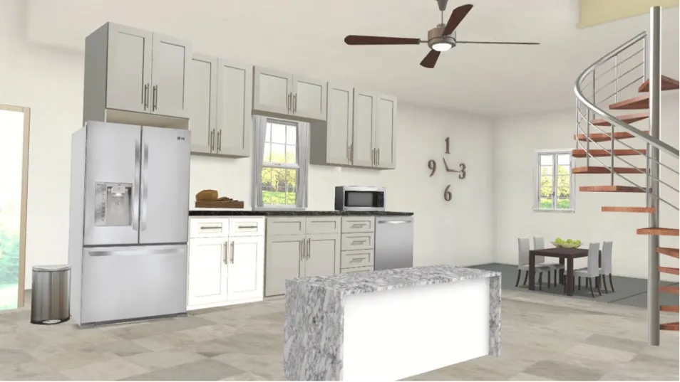 Trendy and relaxed kitchen. Full of grays and whites with a pop of color. Smooth and modern feel.