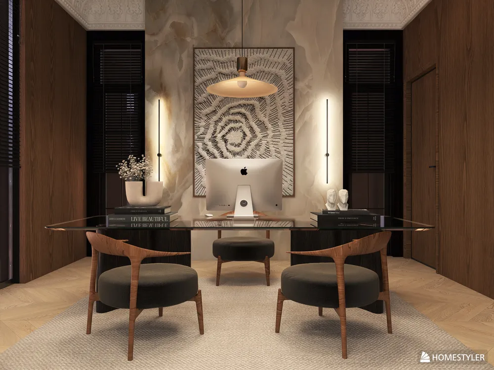 Modern, rich-style, with warm lighting. Corner office facing the Manhattan views.