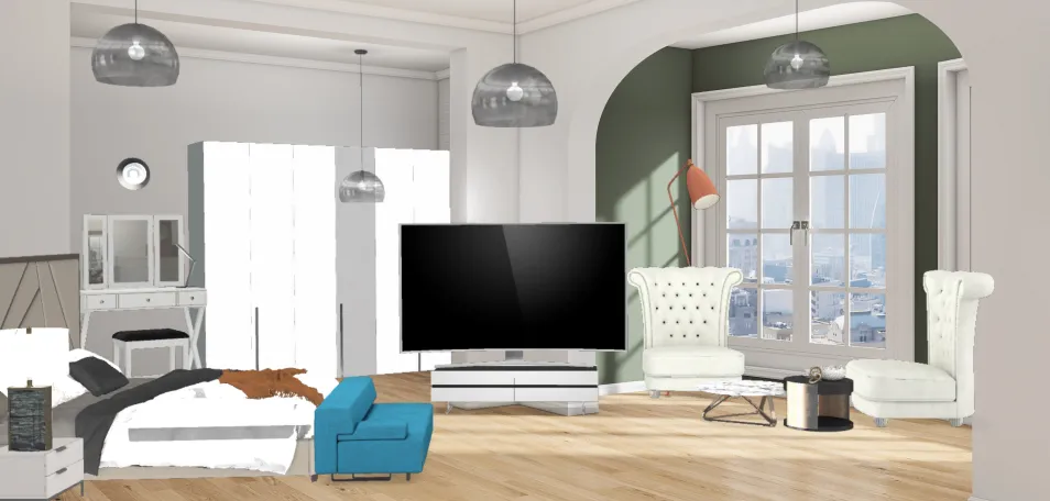 um grande quarto com uma zona de varanda com muita luz e janelas uma grande iluminação e algumas cadeiras na varanda para dar o melhor conforto uma grande cama com uma zona de estar ao fundo uma tv enorme para usufruir dos bons momentos e depois uma zona de closet com grande armário e um penteador.