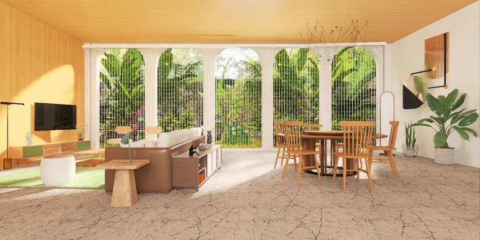 Salas integradas com estilo rústico e elementos naturais como a pedra e madeira.