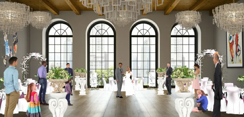 Beautiful wedding reception venue with big windows overlooking the scenery outside.