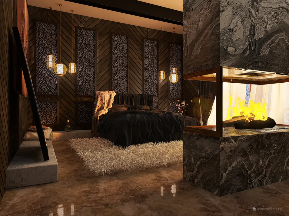 A luxury master bedroom with lots of soft fabrics and natural materials. A bedroom to sleep, relax and enjoy the warmth of a fire. A conformtable room to wind down after a long day of work.